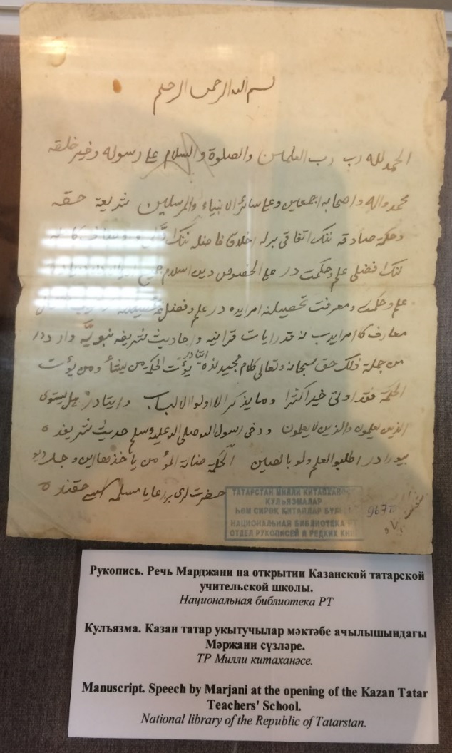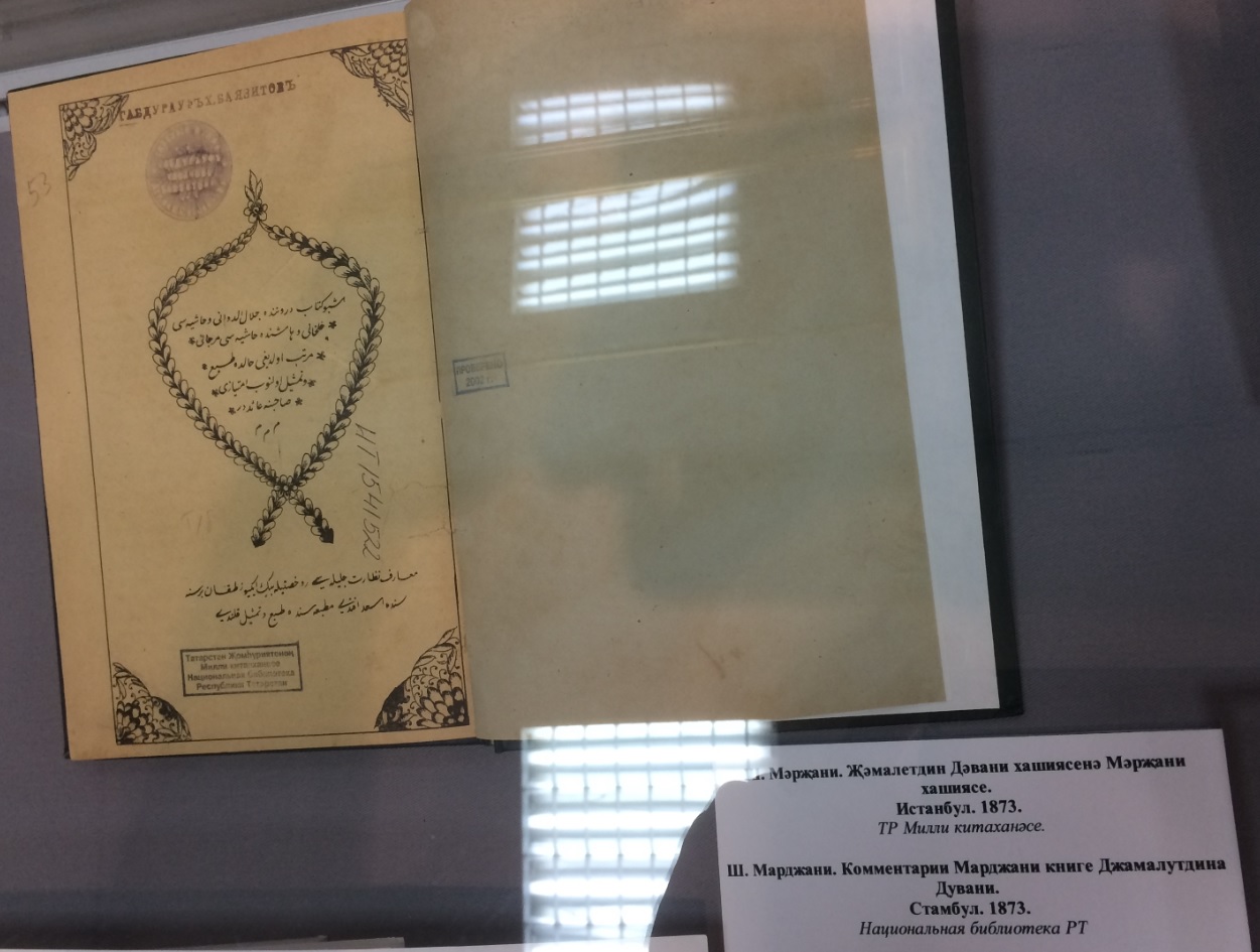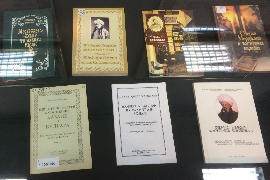 Күргәзмәдәге экспонатлар арасында Татарстан Республикасы Милли китапханәсенең кулъязмалар һәм сирәк китаплар бүлегендә сакланучы искебасма китапларны һәм кулъязмаларны да күрергә мөмкин. Мәсәлән: Ш.Мәрҗанинең 1870 елда Казанда басылган «Китабе Назурәтел-хакк фи фарзиятел-гәшаэ вә әннә ләм йугыйбуш-шәфәкъ» һәм 1873 елда Истанбул шәһәрендә чыккан «Җәмалетдин Дәвани хашиясенә Мәрҗани хашиясе», 1915 елда дөнья күргән «Мәрҗани: Шиһабетдин әл-Мәрҗани хәзрәтләренең вилядәтенә йөз ел тулу (1233–1333) мөнәсәбәте илә» китаплары; кулъязмалардан мәшһүр фикер иясе Казан татар укытучылар мәктәбе ачылганда сөйләгән чыгышының үз кулы белән язылган караламасы, мөфти С.Тәфкилевнең Ш.Мәрҗанигә хаты һәм Шиһабетдин Мәрҗани хәзрәтләре өстеннән язылган шикаять. Биредә шулай ук Милли китапханәнең татар әдәбияты һәм туган якны өйрәнү бүлегендә сакланучы хәзерге басма китаплар да куелган.