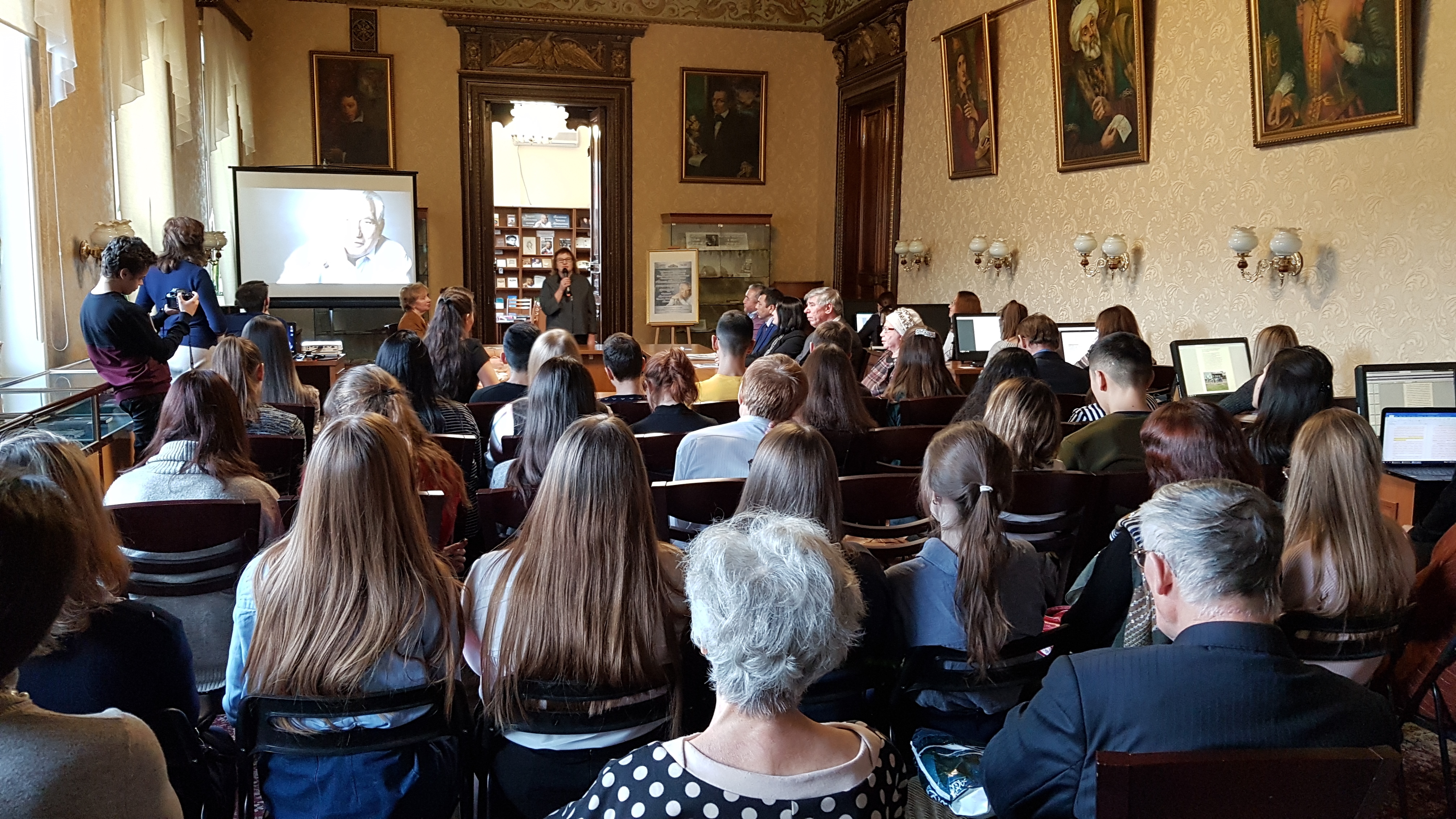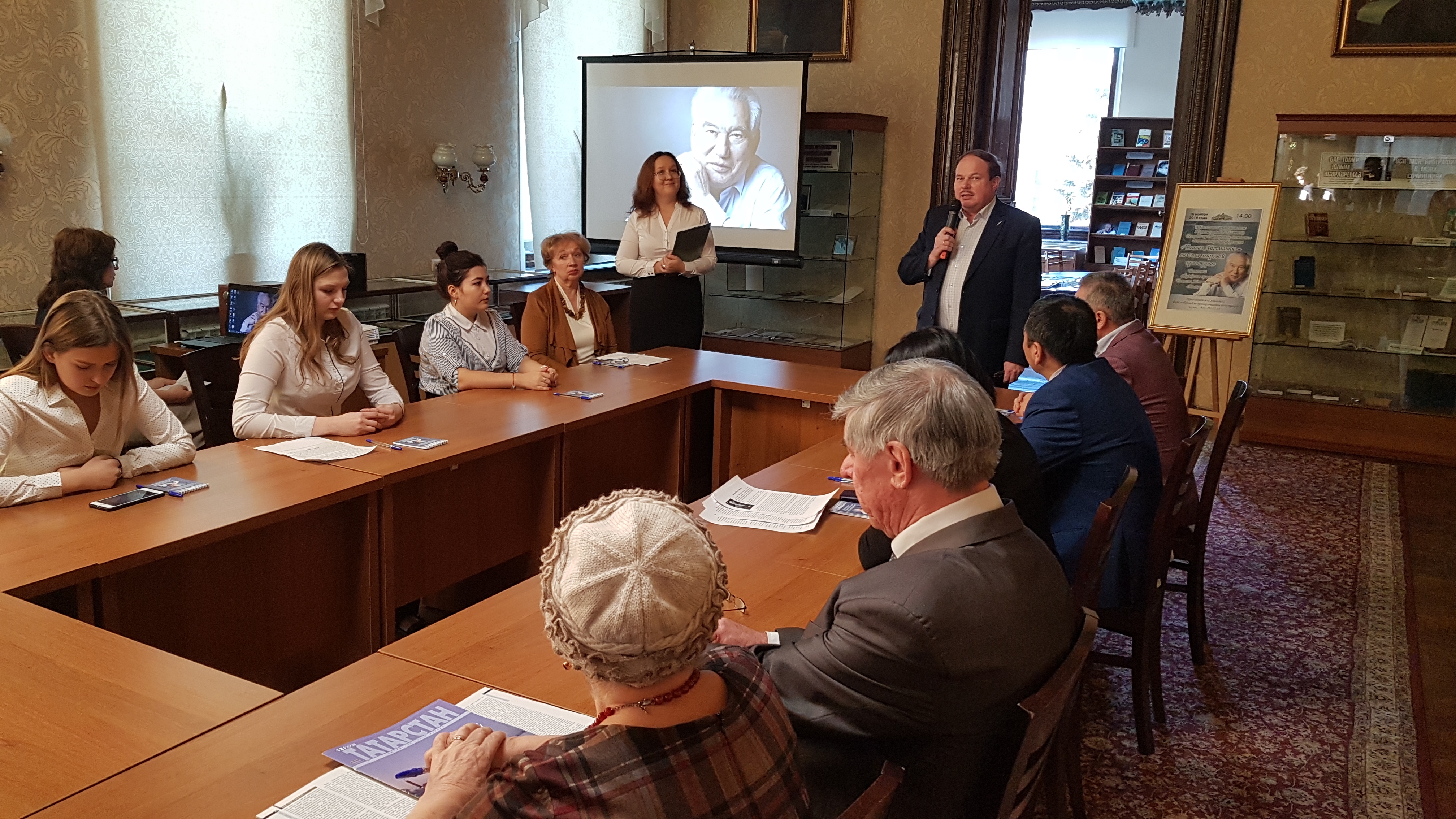 Китапханә хезмәткәрләре Нәргизә Вәлиәхмәтова һәм Надежда Ганиева әзерләгән электрон презентацияне һәм буктрейлерны тамашачылар шулай ук зур кызыксыну белән карады.