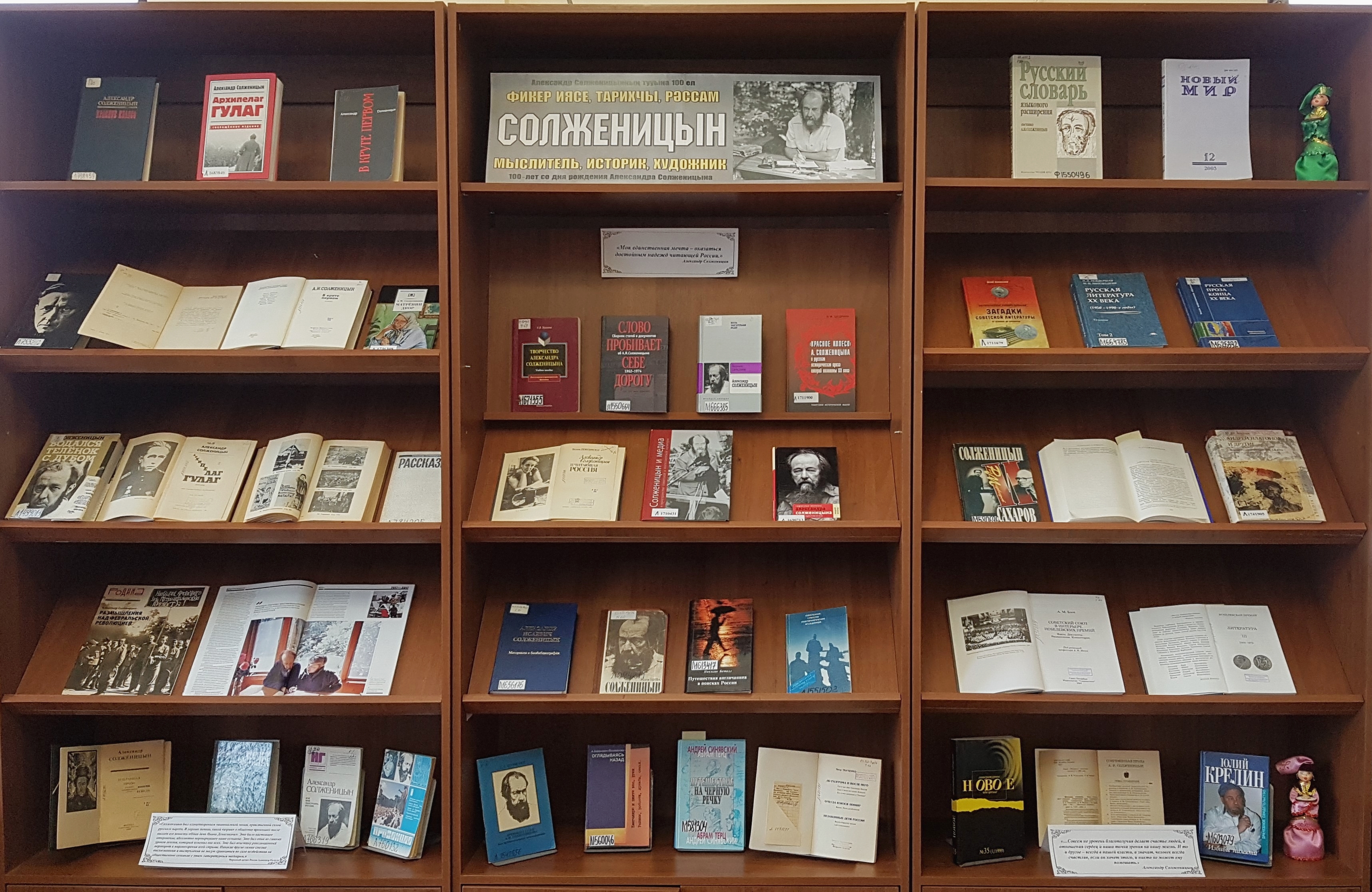 Экспозиция Александр Солженицынны әдип, публицист, тарихчы, идеолог, җәмәгать һәм сәясәт эшлеклесе буларак ача. Күргәзмәдә авторның төрле елларда чыккан әсәрләре, аның тормышы һәм иҗат эшчәнлеге турында китаплар, библиографик белешмәләр, газета һәм журналларда басылган мәкаләләр урын алган.