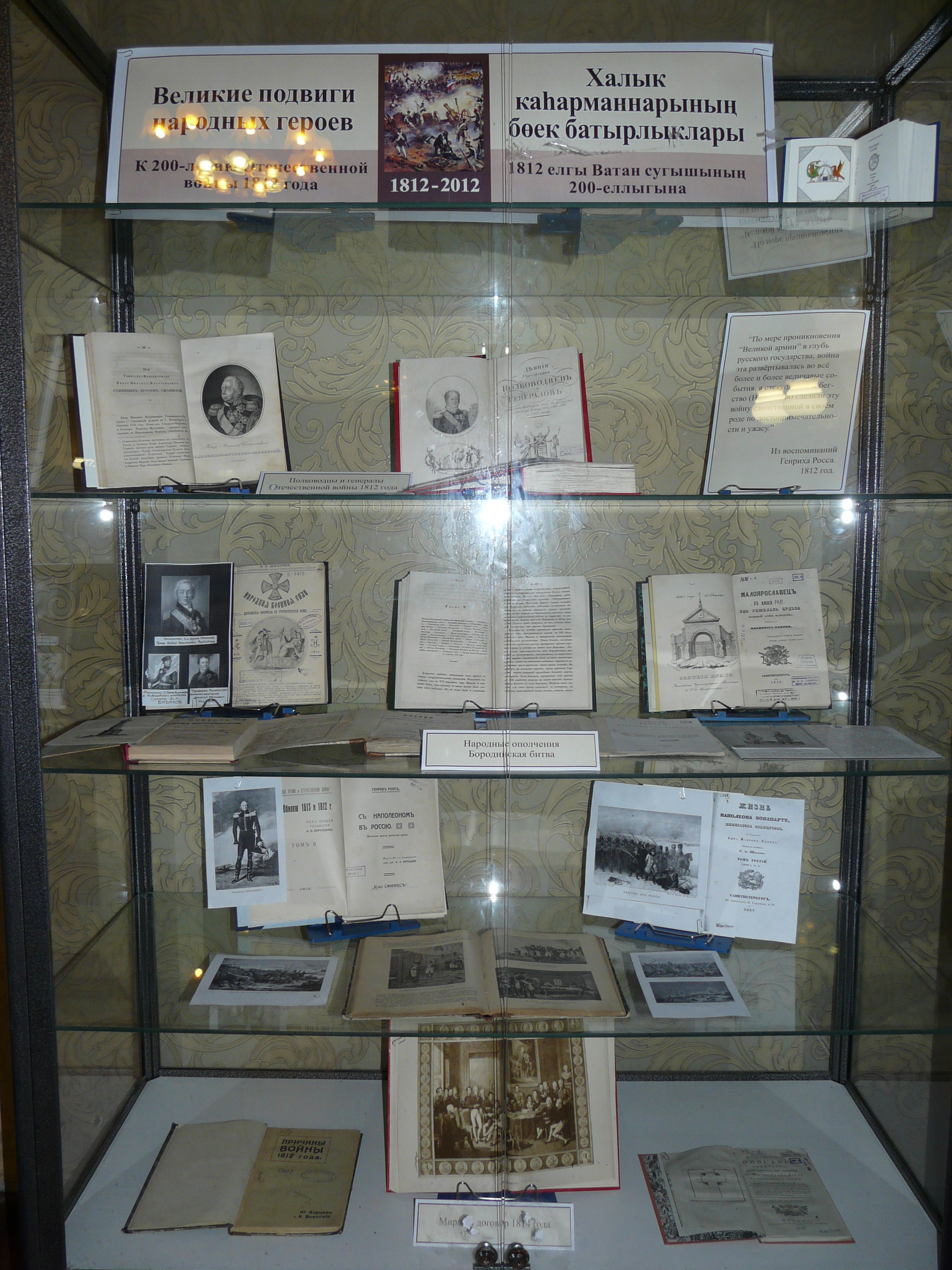 Татарстан Республикасы Милли китапханәсенең Зур уку залында (Казан шәһәре, Кремль урамы, 33 нче йорт), 1812 нче елгы Ватан сугышының 200 еллыгы уңае белән, китапханәнең кулъязмалар һәм сирәк китаплар бүлеге хезмәткәрләре тарафыннан «Халык каһарманнарының бөек батырлыклары» дип исемләнгән күргәзмә оештырылды.