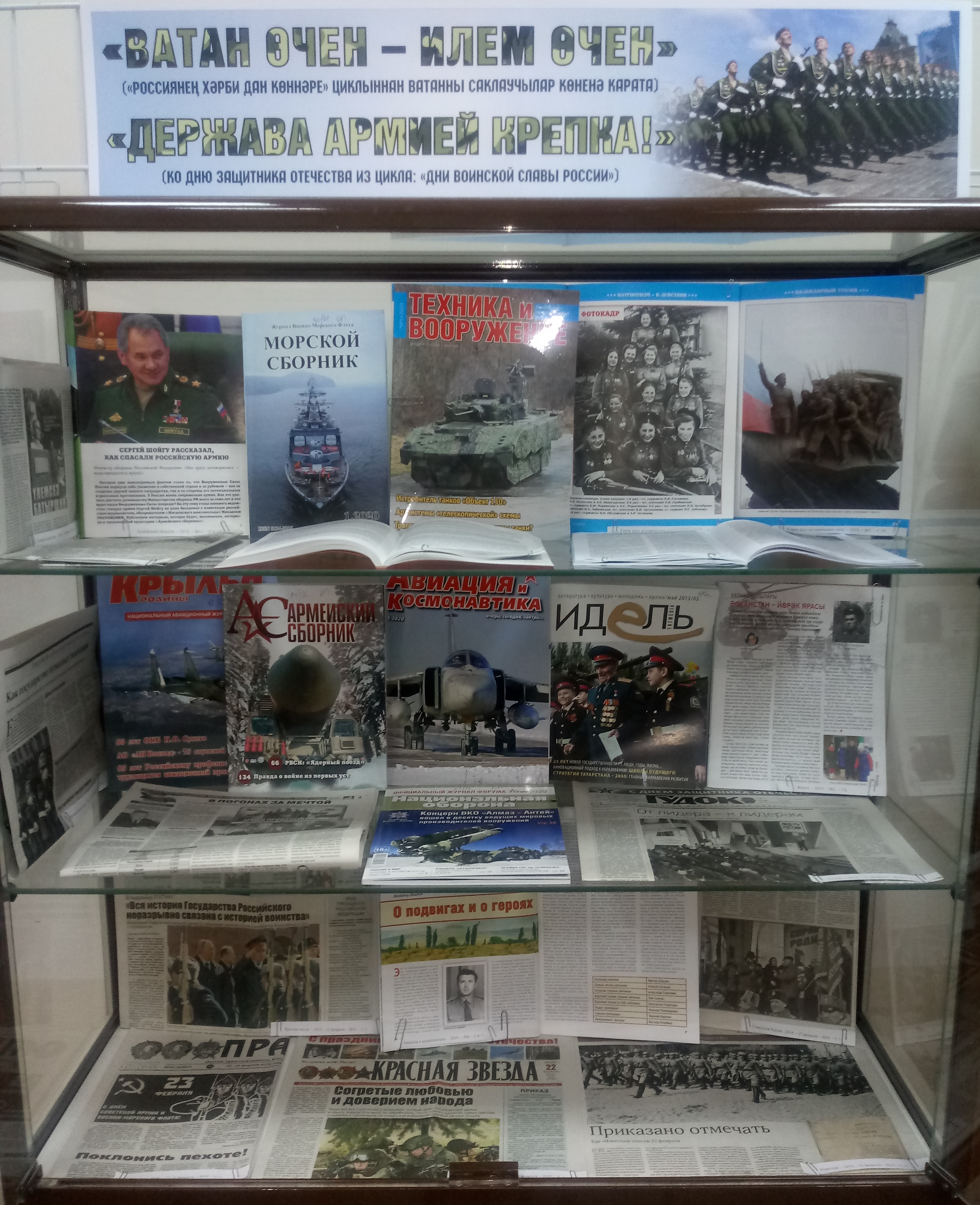 2020 елның 10 февраленнән 25 февраленә кадәр Татарстан Республикасы Милли китапханәсенең икенче бинасындагы уку залында (Казан, К.Маркс ур., 36 йорт) вакытлы матбугат бүлеге хезмәткәрләре тарафыннан әзерләнгән, «Ватан өчен – илем өчен» дип исемләнгән күргәзмә эшли. Ул «Россиянең Хәрби дан көннәре» циклыннан, Ватанны саклаучылар көненә багышланган.