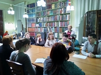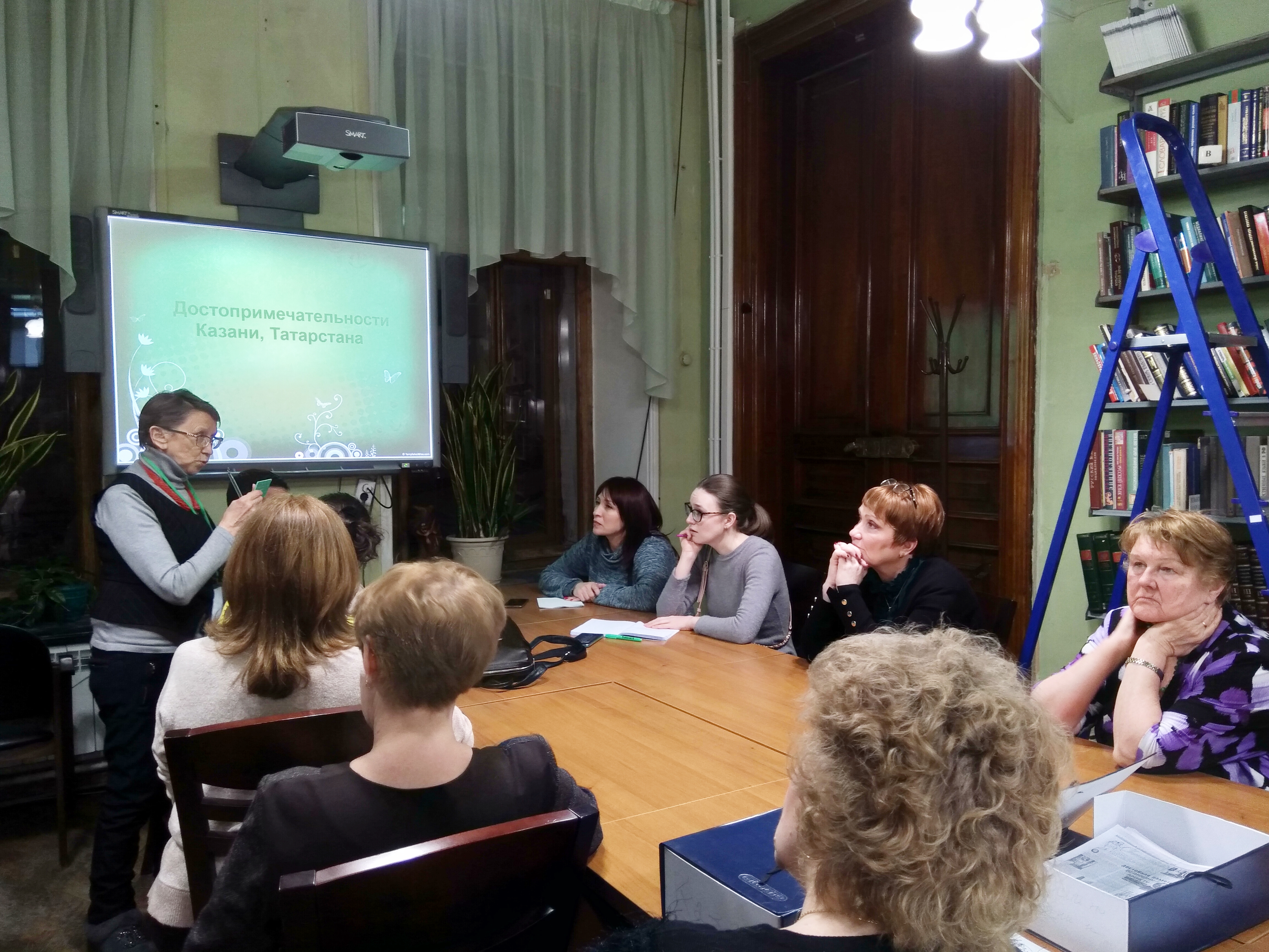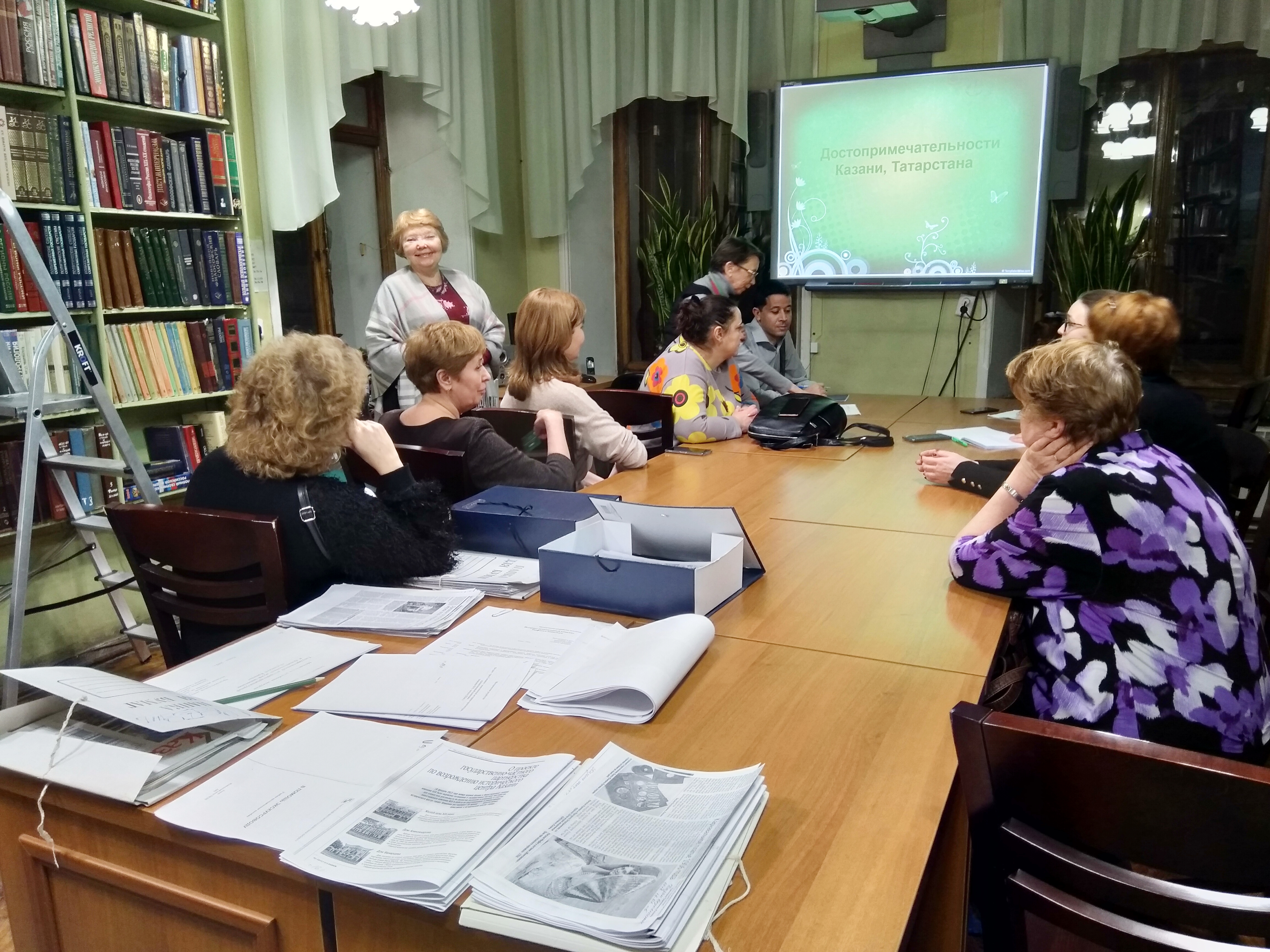 Экскурсоводлар китапханәнең басма һәм электрон мәгълүмат ресурслары белән таныштылар. Алар өчен электрон каталогтан һәм китапханәнең башка белешмә-мәгълүмат ресурсларыннан мәгълүмат эзләү буенча киңәшләр бирелде, Татарстан Республикасы Милли китапханәсе сайтының һәм Татарстан Республикасы Милли электрон китапханәсе порталының виртуаль мәгълүмати ресурслары тәкъдим ителде, шулай ук Интернет челтәрендәге Казан һәм Татарстан һәйкәлләре турындагы кызыклы мәгълүмат ресурсларына күзәтү ясалды. «Шәһәр портретына 100 штрих» дигән CD-дискларның электрон коллекциясе тәкъдим ителде һәм алардан видеоөзекләр күрсәтелде.