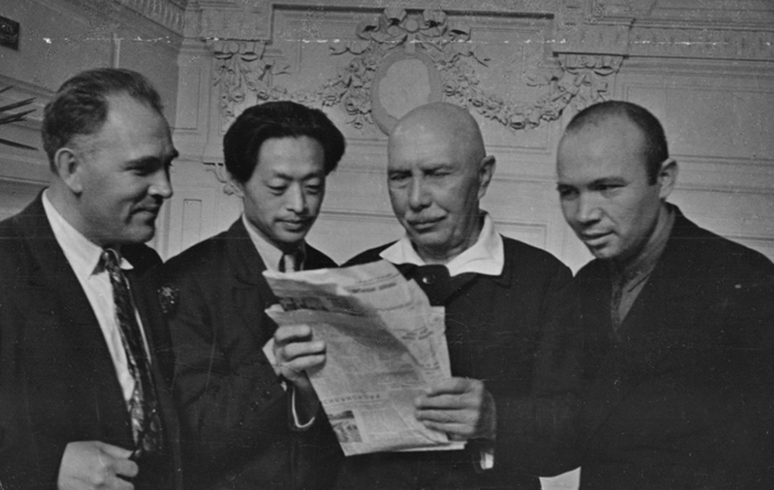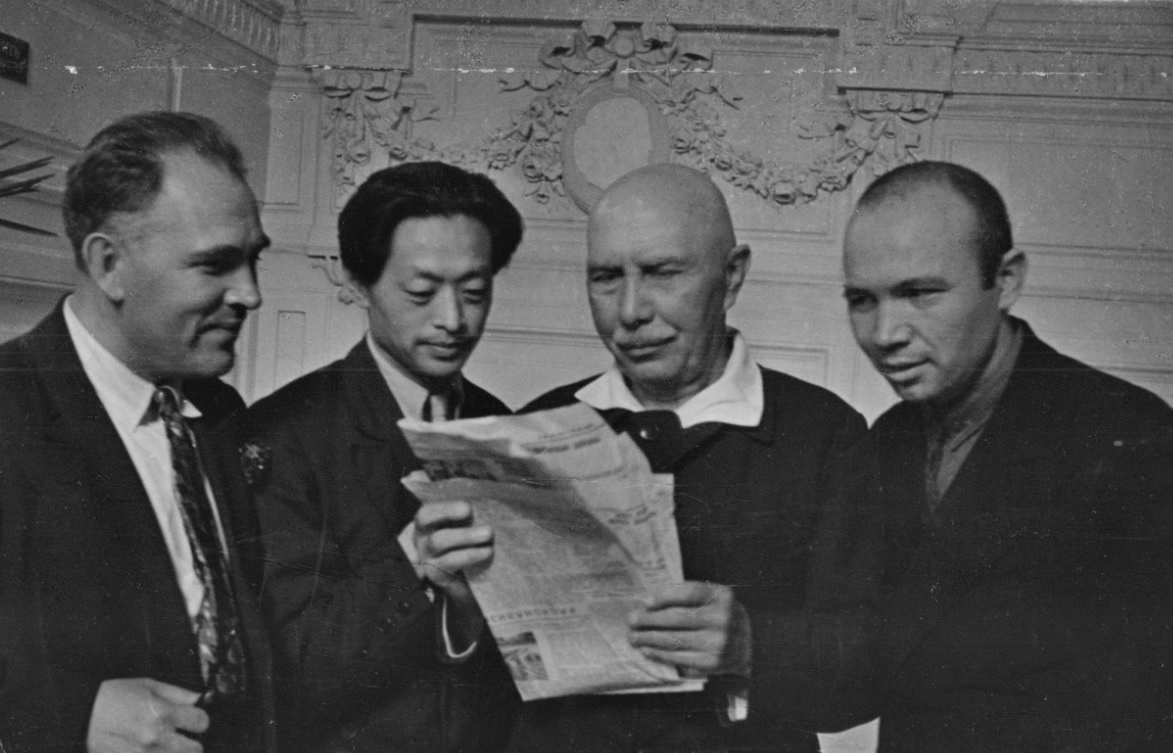 Совет язучыларының I нче Бөтенсоюз съездында тәнәфес вакыты. Уңнан сулга: Гомәр Толымбай, Александр Серафимович, кытай шагыйре Эми Сяо, Кәрим Тинчурин. Мәскәү, 1934 ел