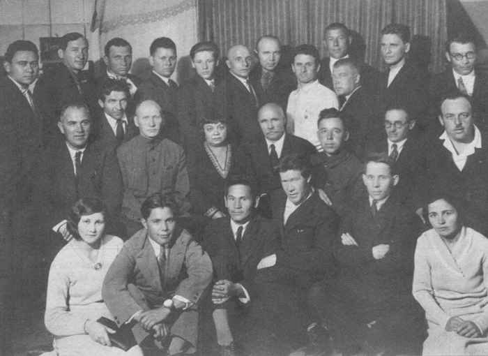 Совет язучыларының I нче Бөтенсоюз съездында. Лилия Сәйфуллина, Александр Серафимович татар язучылары уртасында. Арттагы рәттә сулдан җиденче – Гомәр Толымбай. Мәскәү, 1934 ел