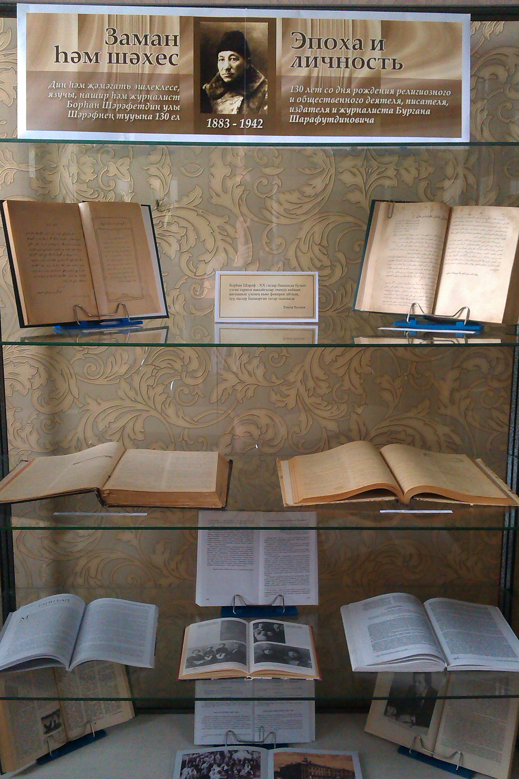 2013 нче елның 1 нче августыннан Татарстан Республикасы Милли китапханәсенең Зур уку залында, дин һәм җәмәгать эшлеклесе, язучы, нашир һәм журналист Борһан Шәрәфетдин улы Шәрәфнең (1883–1942) тууына 130 ел тулуга багышлап, «Заман һәм шәхес» дип аталган күргәзмә куелды. Күргәзмәдә Борһан Шәрәфнең ХХ гасыр башында гарәп графикасында дөнья күргән «Гани бай» китабы белән танышырга мөмкин. Шулай ук әдипнең төрле елларда вакытлы матбугатта басылган мәкаләләре дә урын алган. Биредә, әдипнең хезмәтләре белән бергә, аның турындагы әдәбиятның да бер өлеше бар.