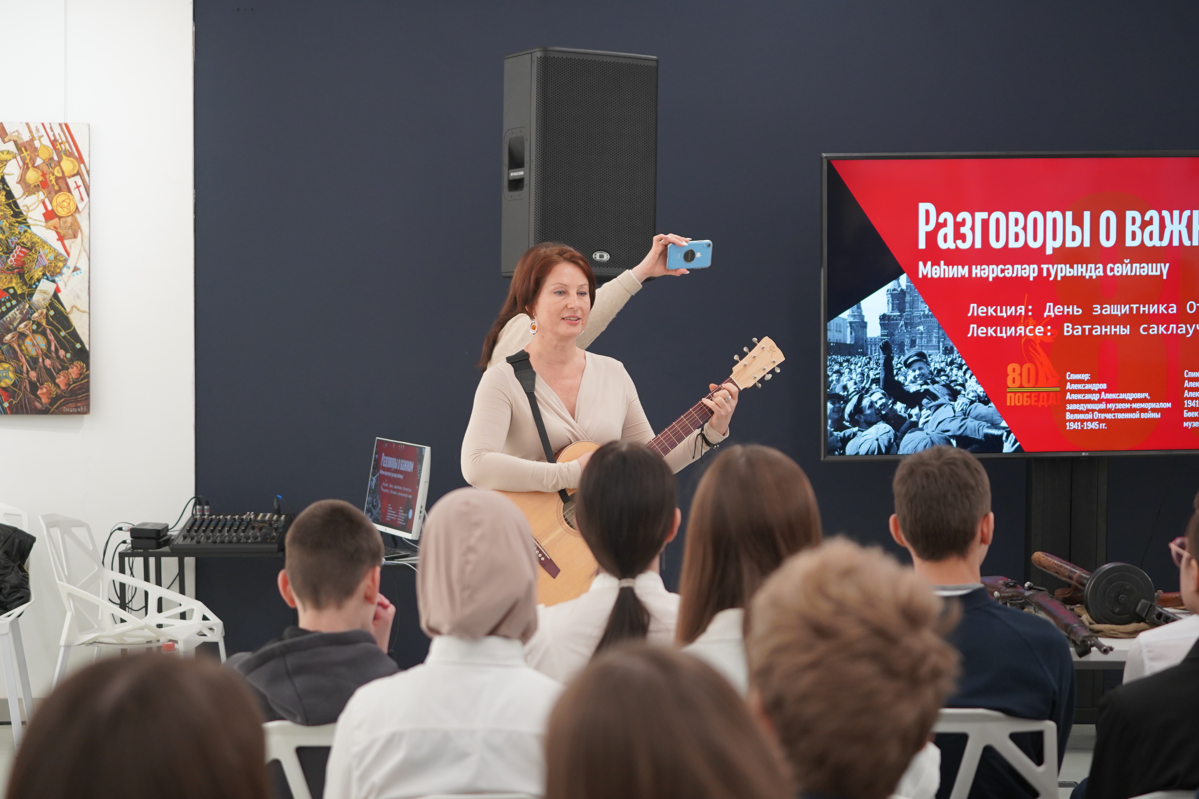 Очрашуны "Мөһим нәрсәләр турында сөйләшү" проекты кысаларында "Кар десанты" хәрәкәтендә катнашучы, балалар өчен яшүсмерләр сменасы җитәкчесе Екатерина Белова чыгышы тулыландырды. Ватанны саклаучылар көне алдыннан укучылар белән бергә ул гитара астында хәрби-патриотик тематикага берничә җыр башкарды.