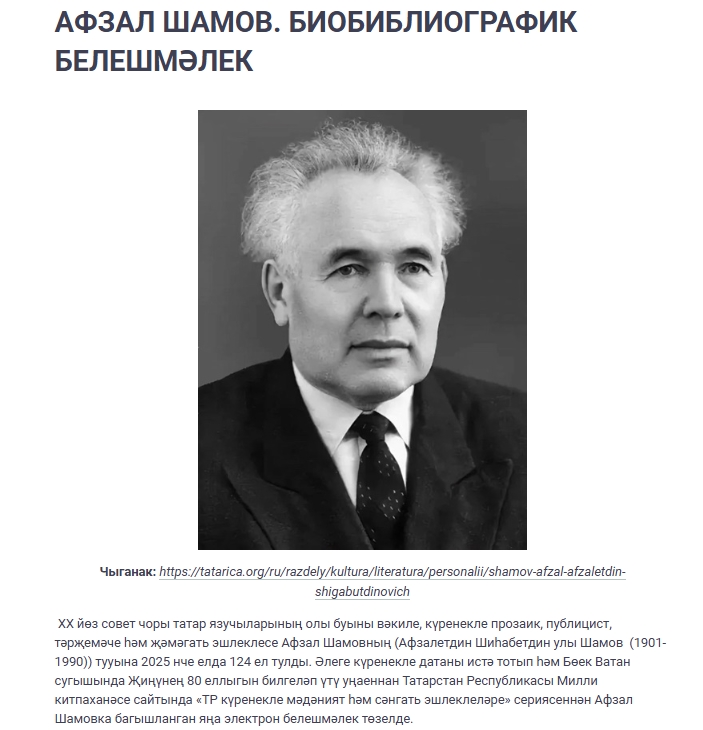 Бөек Ватан сугышында Җиңүнең 80 еллыгын билгеләп үтү уңаеннан Татарстан Республикасы Милли китпаханәсе сайтында «ТР күренекле мәдәният һәм сәнгать эшлеклеләре» сериясеннән Афзал Шамовка багышланган яңа электрон белешмәлек дөнья күрде.