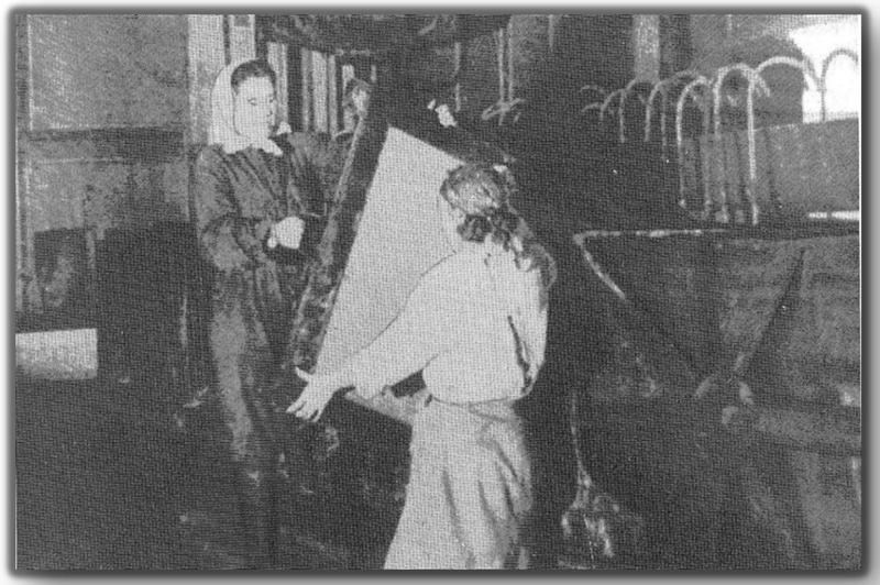 Йөк машиналарын 17 яшьлек кызлар йөртә, 11 яшьлек слесарьлар ремонтлый. Төн уртасыннан иртәнге сәгать бишкә кадәр завод эшчеләре чималны тимер юл вокзалында бушаталар һәм утыргычсыз трамвай вагоннарында предприятиегә ташыйлар. Аннары эш урыннарына таралалар. Идарә хезмәткәрләре көннең беренче яртысында станок артында булалар, аннары гына үз эшләренә тотыналар. Эштән бушаганда хатын-кызлар, кулларына энә алып, шәм фитиле җебеннән фронт өчен оекбашлар, бияләйләр бәйлиләр.