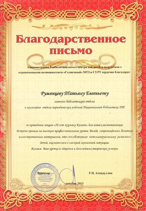 Татарстан Республикасы Милли китапханәсенең вакытлы матбугат бүлеге хезмәткәрләре Казан шәһәре мәктәпләрендә укучыларга патриотик тәрбия бирүдә зур өлеш кертәләр. Шул ук вакытта яшь буын вәкилләре арасында Милли китапханәнең бай фондын, файдалы мәгълүмати ресурсларын, киңкырлы эшчәнлеген пропагандалыйлар. Алар бик еш үзләренә карата укучылардан һәм укытучылардан рәхмәт сүзләре ишетәләр. Мәктәпләр җитәкчелеге рәсми рәвештә дә рәхмәтләрен белдереп тора.