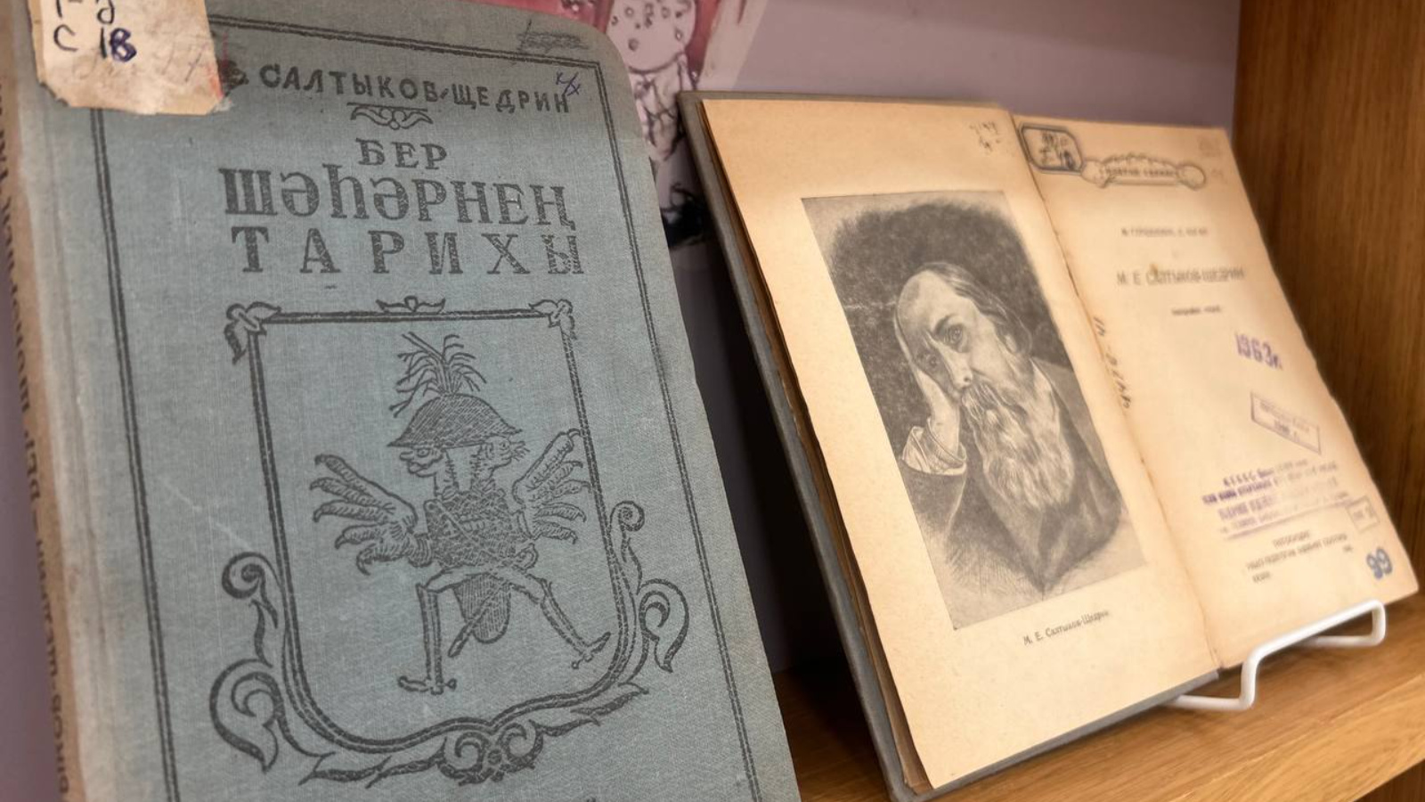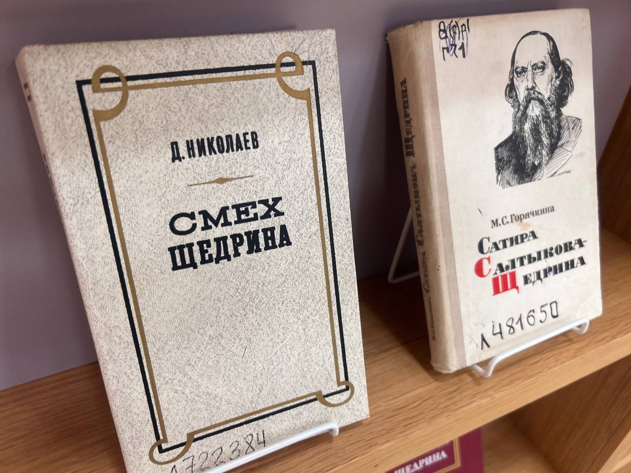 Мәсәлән, «Головлев әфәнделәр» повестенда автор дворянлыкның деградациясен һәм гаилә кыйммәтләренең җимерелүен күрсәтә, бу аны рус реалистик әдәбиятының төп әсәрләренең берсе итә. «Помпадурлар һәм помпадуршалар сериясе» хикәяләре түрәләр образларын үз эченә ала, аларны язучы аяусыз тәнкыйтьли. Күргәзмәдә шулай ук М.Е. Салтыков-Щедринның латин графикасындагы һәм татар телендәге китаплары да тәкъдим ителде.
