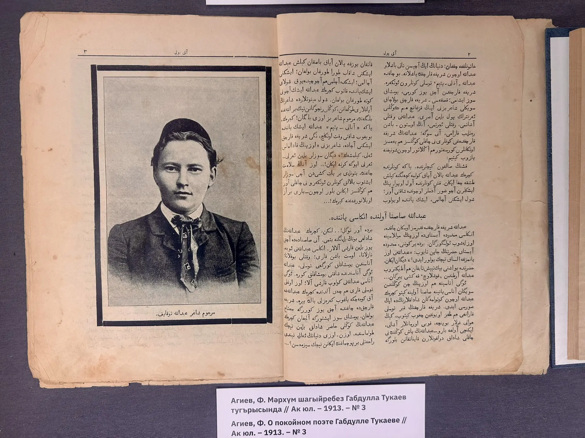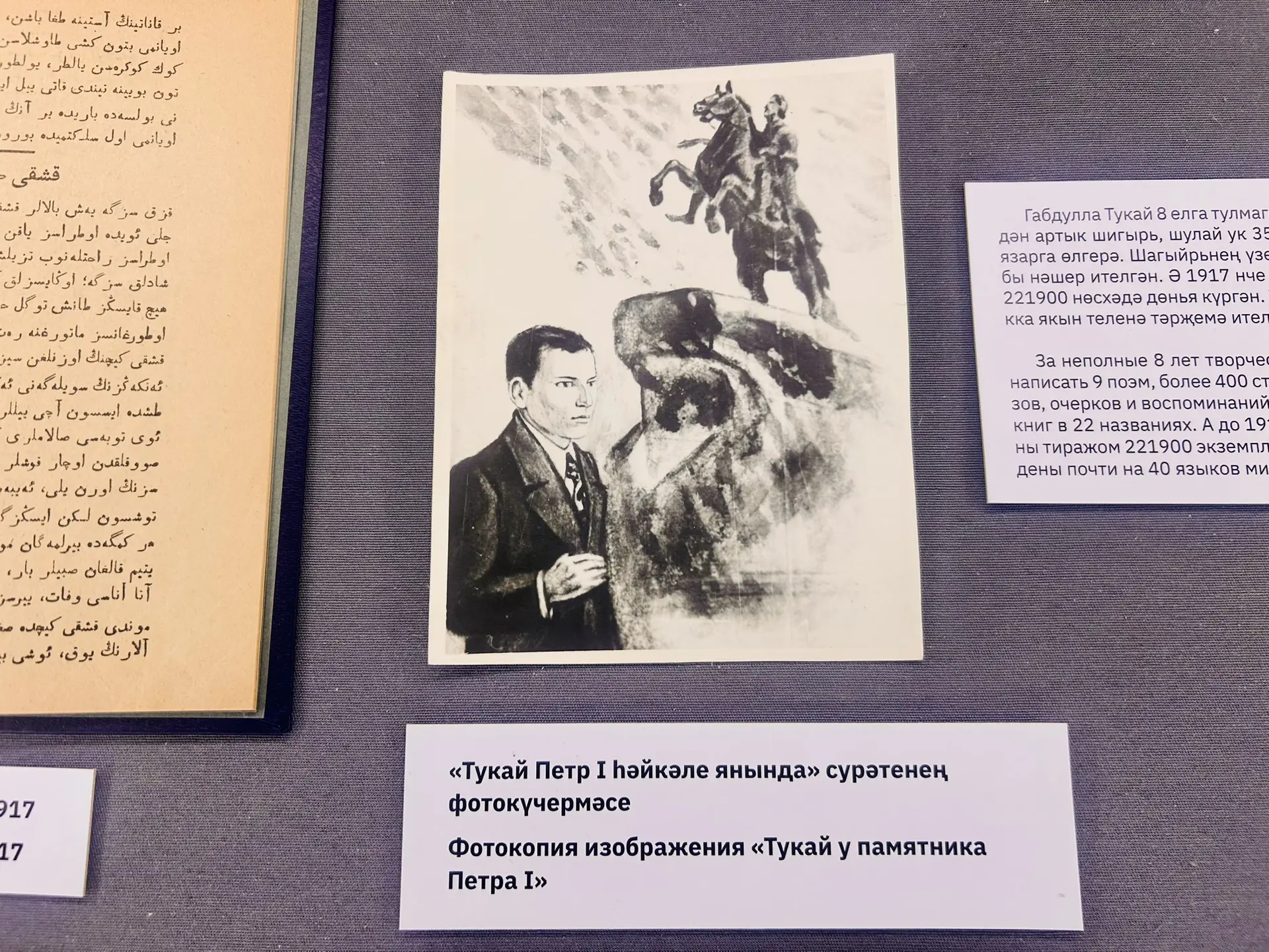 Анда Тукайның исән чагында басылган китаплары, шул исәптән, шагыйренең 1907 елда дөнья күргән беренче китабы, шигырь җыентыклары, проза, балалар өчен китаплар, журнал мәкаләләре, шулай ук Төркия, Финляндия, Япония һәм Кытайда яшәүче татар мөһаҗирләре чыгарган басмалар һәм башка материаллар тәкъдим ителде Күргәзмә 15 майга кадәр дәвам итәчәк.
