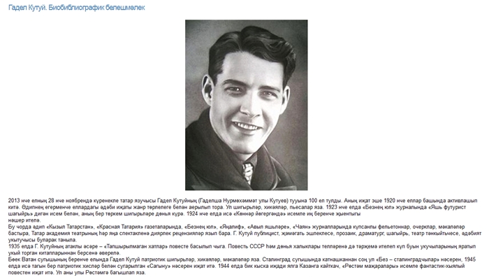 исемле яңа электрон белешмәлек дөнья күрде. Күренекле татар совет язучысы, «Тапшырылмаган хатлар» повестенең авторы Гадел Кутуйның тууына 2013 нче елның 28 нче ноябрендә 110 ел тулды.