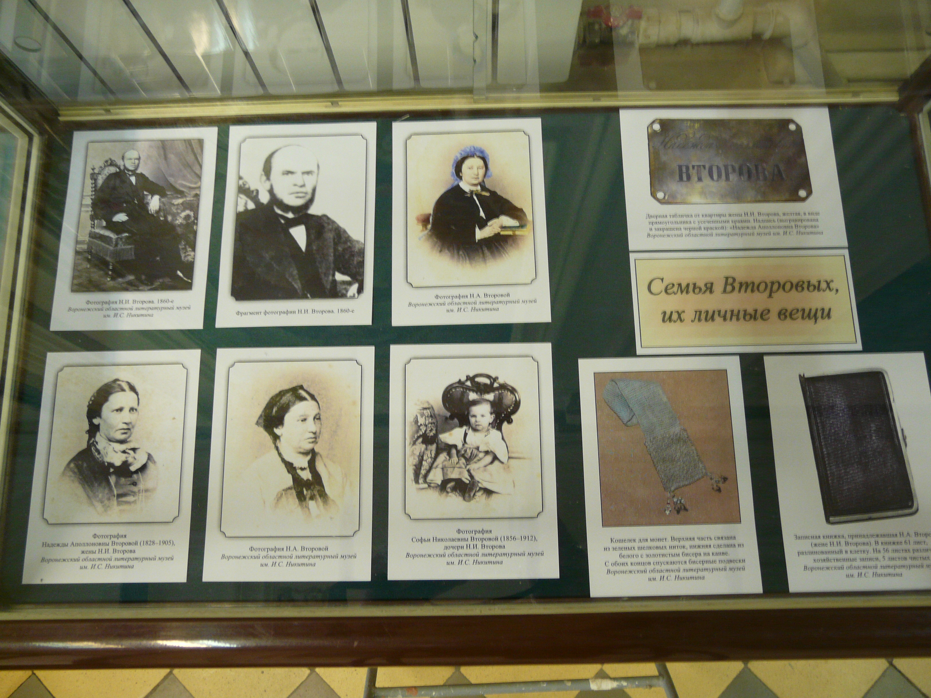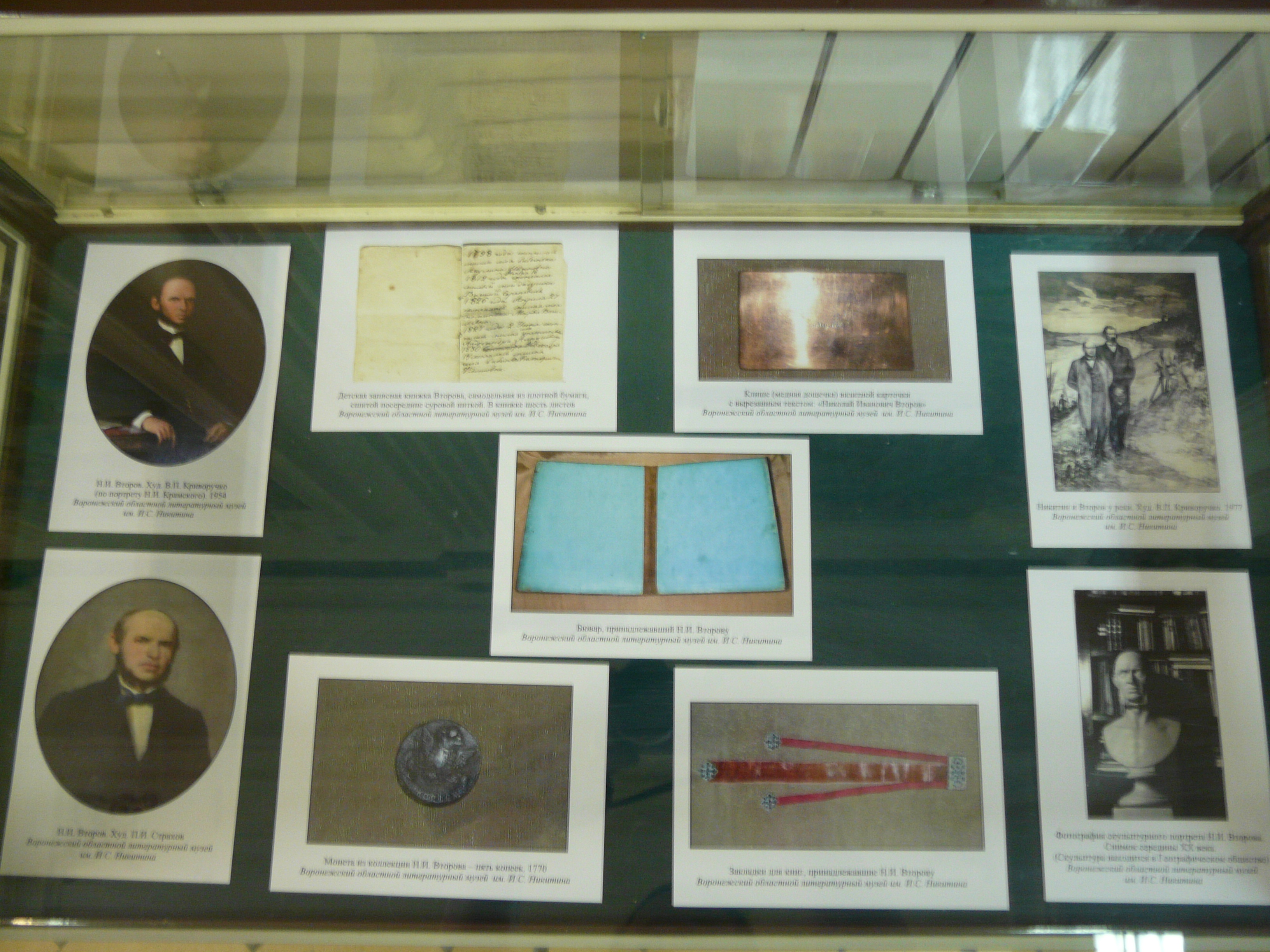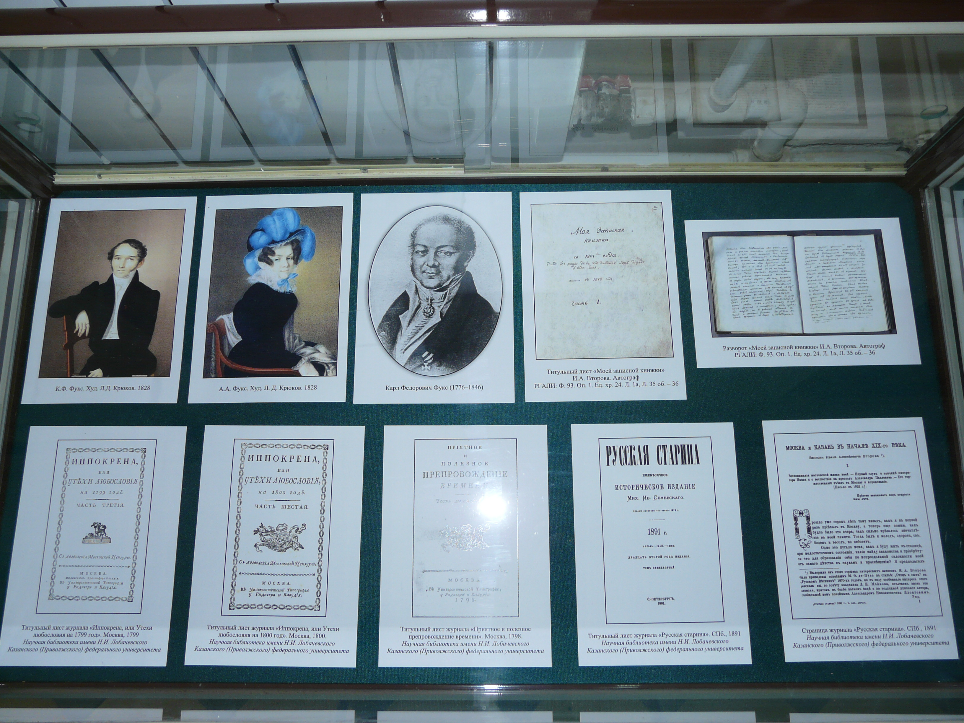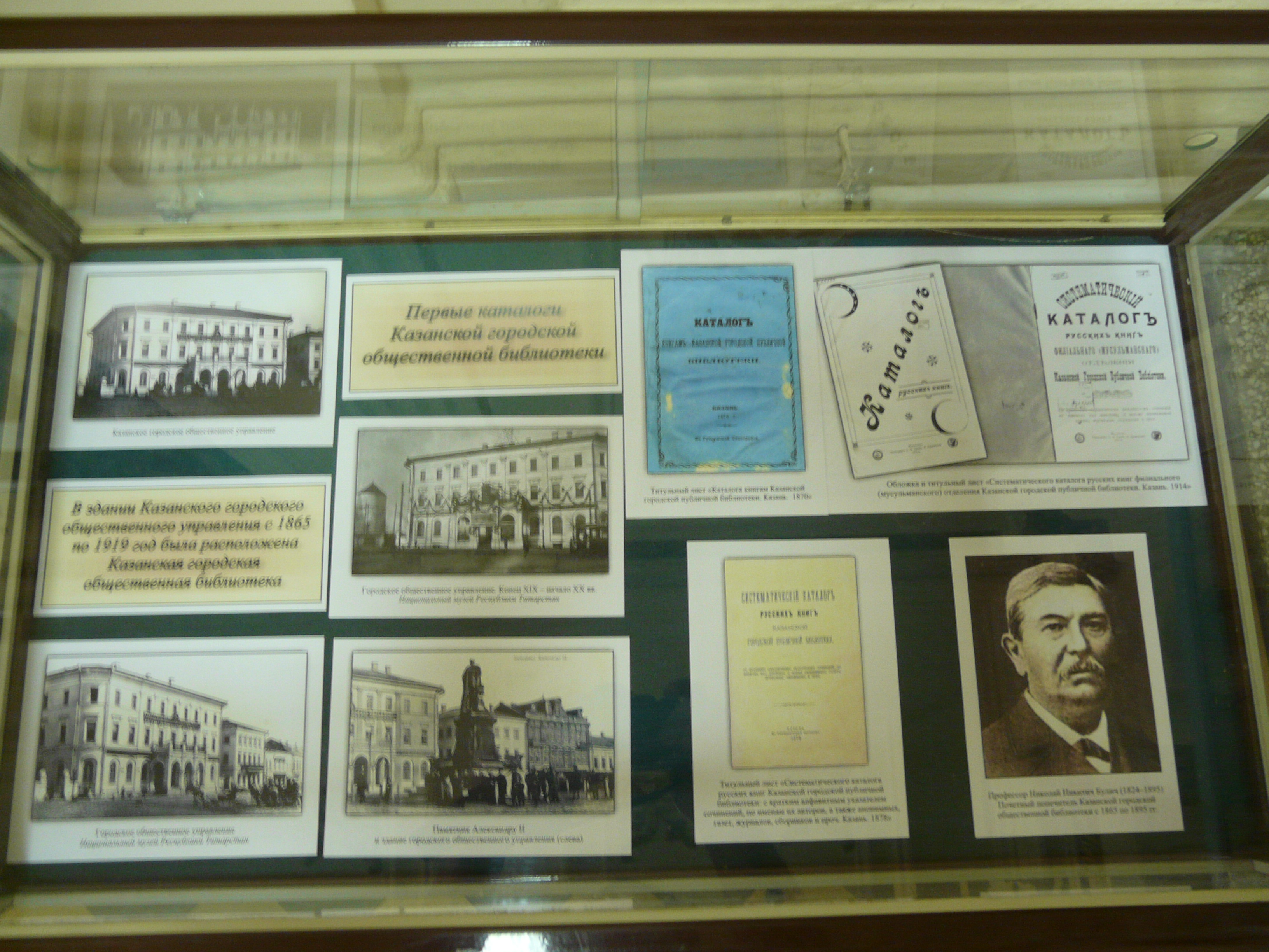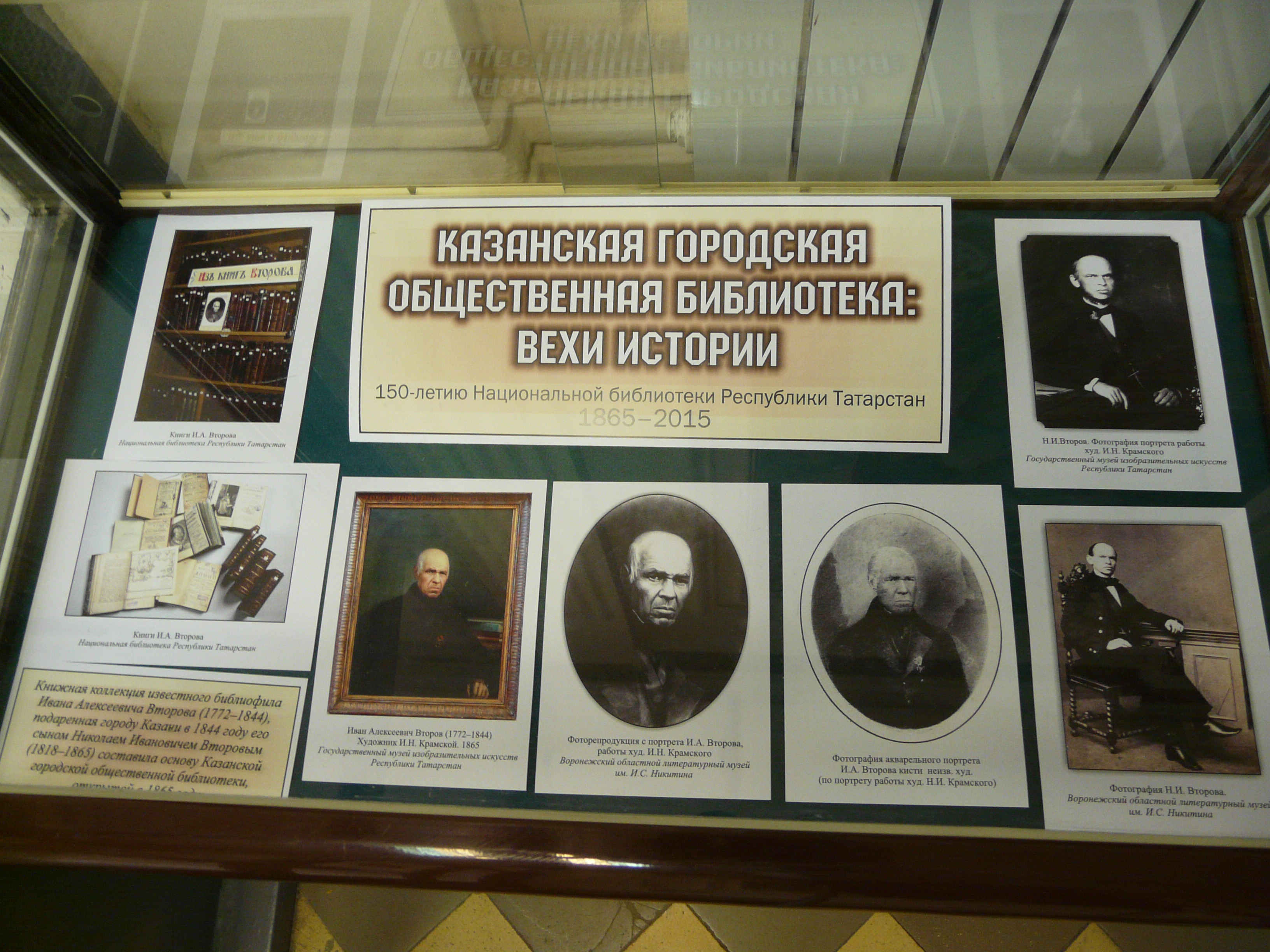 Күргәзмәдә үзенең шәхси китап тупланмасын Казан шәһәренә бүләк итеп җәмәгать китапханәсенә нигез салган Иван Алексеевич Второв портретыннан, Второвлар гаиләсе әгъзаларының фоторәсемнәреннән күчермәләр тәкъдим ителә. Шулай ук 1865 елдан алып 1919 елга кадәр китапханә урнашкан бинаның һәм китапханәнең 1870, 1878 елларда басылып чыккан каталогларының фотосурәтләрен күрергә була.