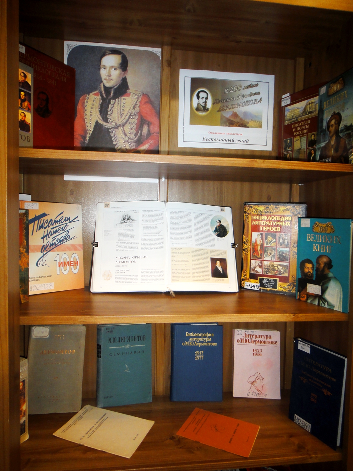 ТР Милли китапханәсенең мәгълүмат-библиография бүлегендә рус шагыйре, язучы Михаил Юрьевич Лермонтовның тууына 200 ел тулуга багышланган күргәзмә куелды. Ул октябрь ае дәвамында эшлиячәк. Күргәзмәдә бөек шагыйрь турындагы бүлек фондында булган мәгълүмати чыганаклар: «Лермонтов энциклопедиясе», «Әдәби геройлар энциклопедиясе», сүзлекләр, белешмәлекләр, шагыйрь турындагы библиографик күрсәткечләр һ. б. урын алды.