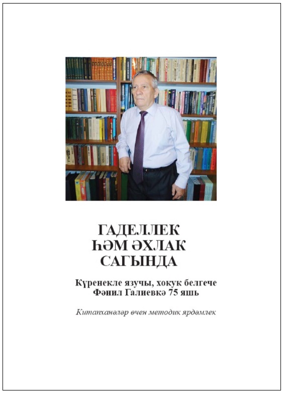 Гаделлек һәм әхлак сагында: күренекле язучы, хокук белгече Фәнил Галиевкә 75 яшьтулу уңае белән китапханәләр өчен методик ярдәмлек / Татарстан Респ. Милли к-ханәсе; төз. Г.Д.Нәҗмиева; мөх-ре И.Г.Һадиев. –Казан: Милли китап,2015. – 22 б.