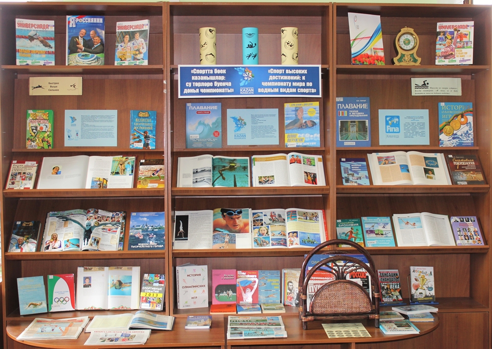 Анда Татарстан Республикасы Милли китапханәсе фондларыннан алынган, Бөтендөнья спорт аренасында зур уңышлар яулаган Россия һәм чит ил йөзүчеләренең ярышларга әзерләнү тәҗрибәсен туплаган материаллар тупланган. Булачак чемпионнарны йөзәргә өйрәтү методикасы язылган китаплар җыелмасы, дөньяда һәм Татарстанда су полосы спорты туу турында язмалар, Казанның «Синтез» ватерпол командасы казанышларын, команданың үткән юлын чагылдыручы, Россия һәм чит ил спортсменнарының йөзү спортындагы җиңүләрен яктыртучы мәкаләләр экспозициянетагын да тулыландыра.