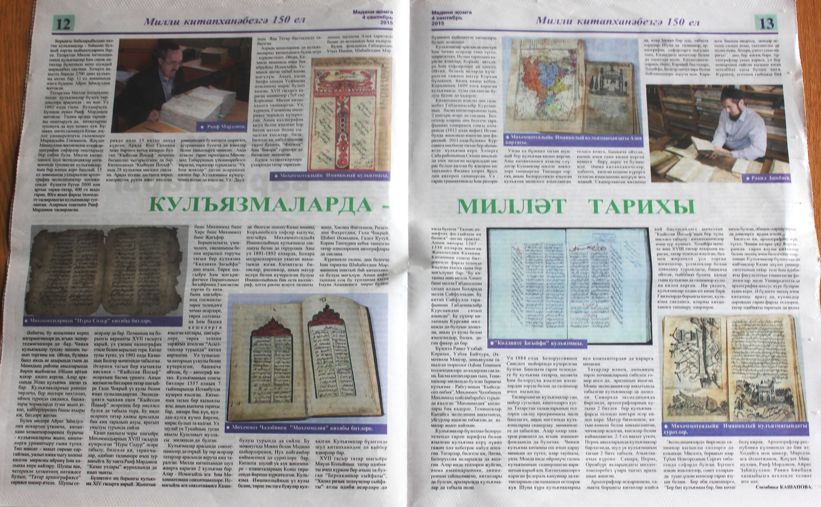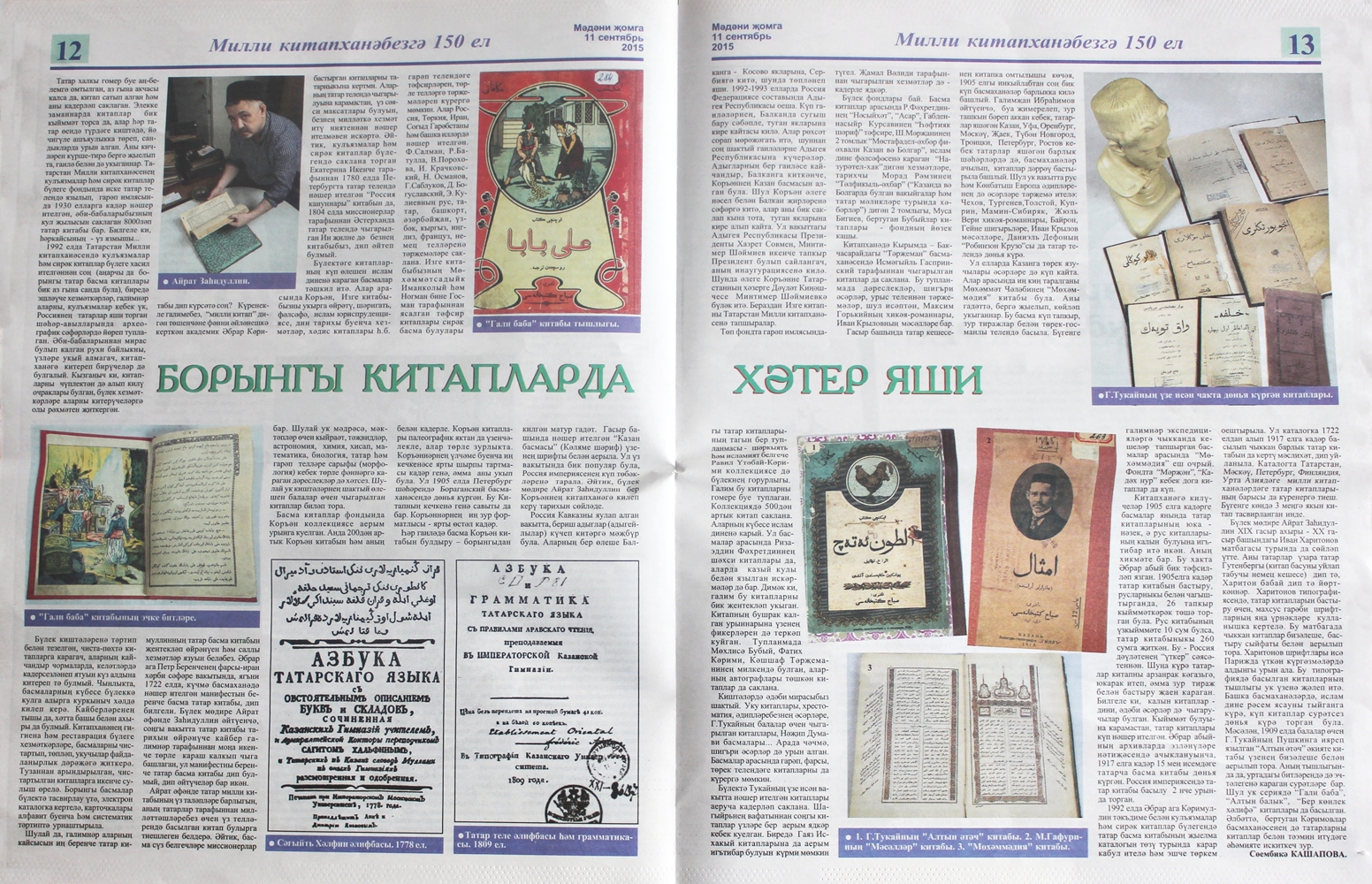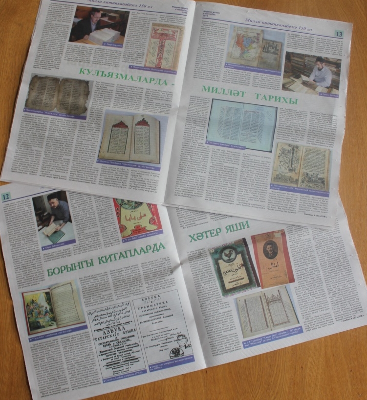 «Мәдәни җомга» газетасының быелгы 34 нче санында (4 нче сентябрь) «Кулъязмаларда – милләт тарихы», 35 нче санында (11 нче сентябрь) «Борынгы китапларда хәтер яши» дигән күләмле мәкаләләрне укырга тәкъдим итәбез. Аларның авторы – мәдәният-сәнгать темаларын зур осталык белән яктыртучы танылган журналист Сөембикә Кашапова. Мәкаләләрдә Татарстан Республикасы Милли китапханәсенең кулъязмалар һәм сирәк китаплар бүлегендә сакланучы рухи мирас хәзинәләре турында кызыклы мәгълүматлар тупланган. Текстлар бай эчтәлекле, җиңел укылышлы, аларны темага ифрат туры килә торган дистәләгән фоторәсем дә тулыландырып тора.