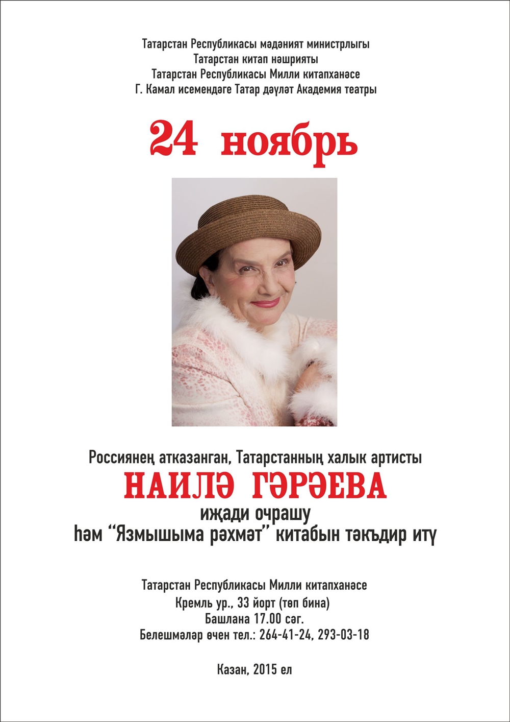 2015 нче елның 24 нче ноябрендә 17.00 сәгатьтә Татарстан Республикасы Милли китапханәсенең Зур уку залы «Театр кунакханәсе» тамашачыларын Г.Тукай исемендәге Дәүләт премиясе лауреаты, Россиянең атказанган, Татарстанның халык артисты Наилә Гәрәева белән очрашуга һәм «Язмышыма рәхмәт» исемле китабын тәкъдир итү кичәсенә чакыра.