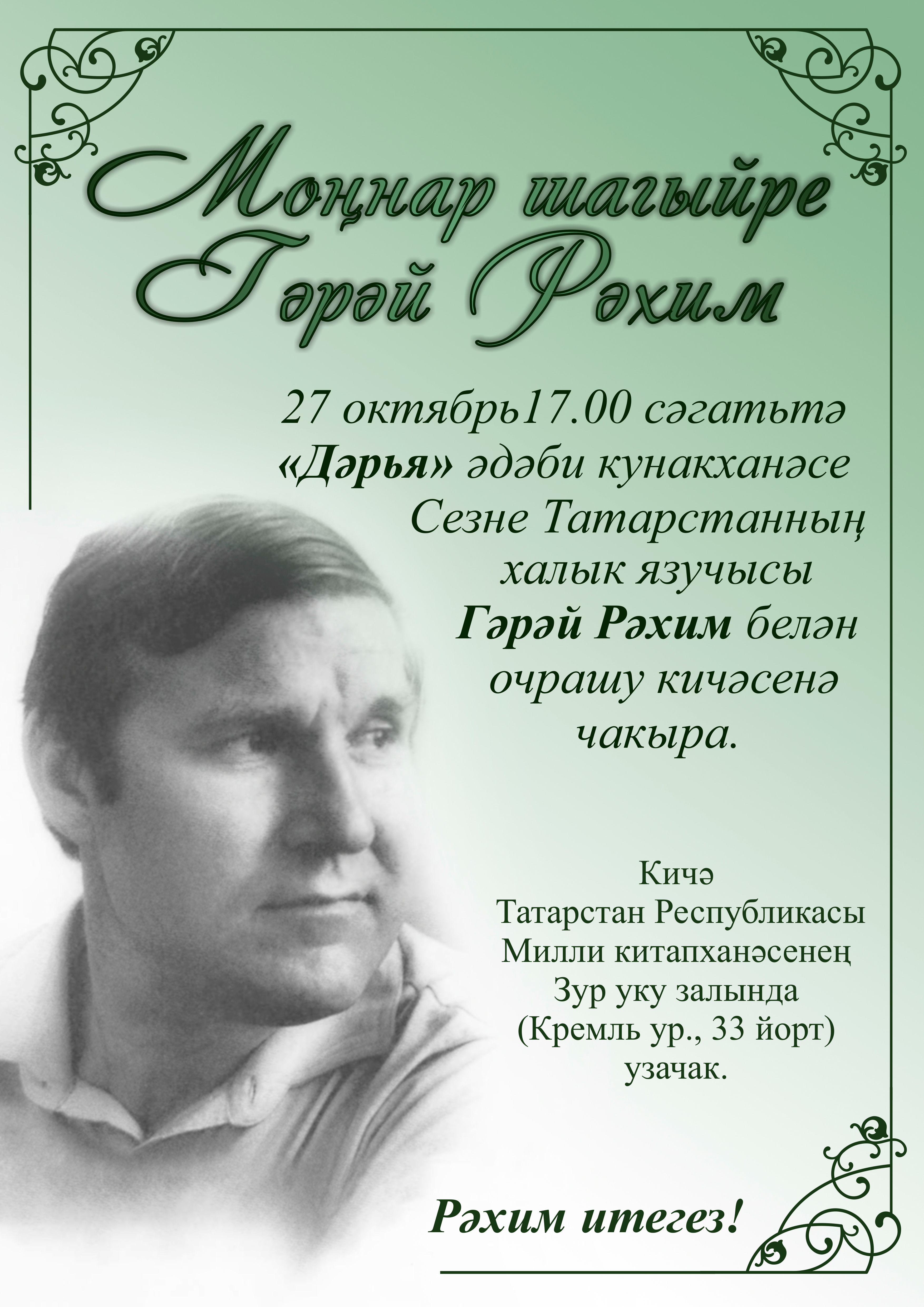 Күп китаплар авторы, язучы, шагыйрь һәм җәмәгать эшлеклесе Гәрәй Рәхим иҗатына багышланган бу әдәби кичә кызыклы «сюрпризлар» белән истә калачак, шулай ук Георгий Ибушев, Геннадий Максимов, Айдар Габетдинов һәм «Бәрмәнчек» дәүләт фольклор ансамбле, керәшен җәмгыяте вәкилләре, каләмдәш дуслары, шагыйрьләр, язучылар, якыннары да катнашыр дип көтелә.